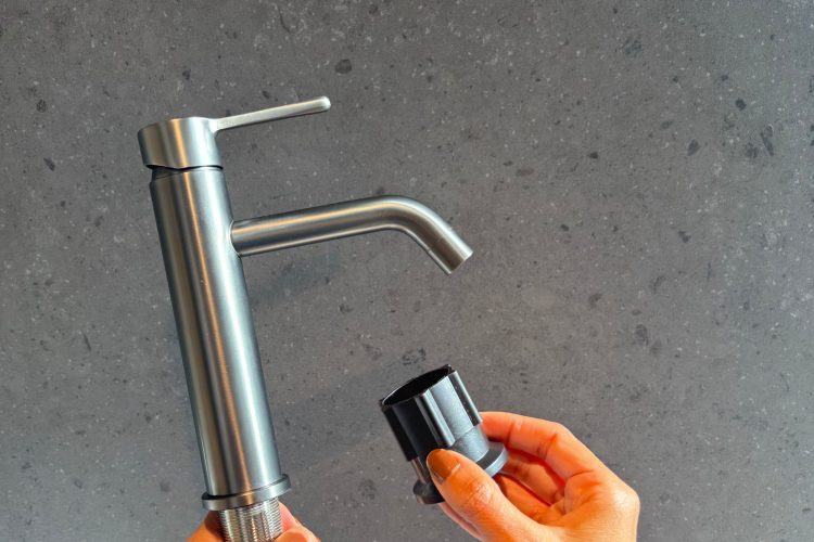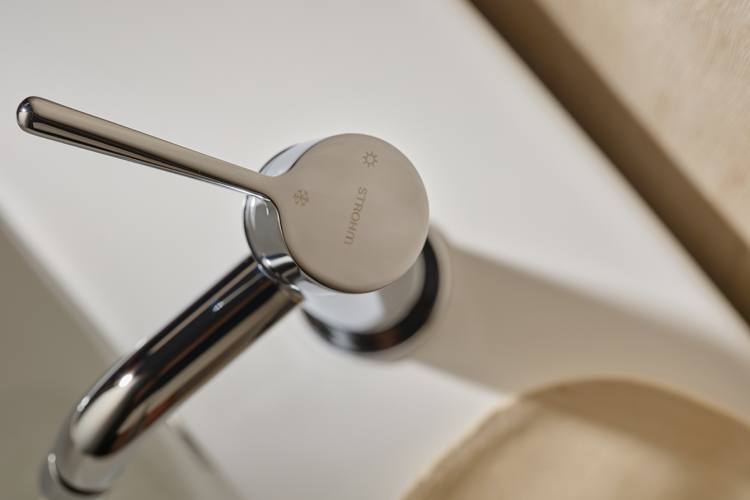 The handle’s design is inspired by the very essence of water: an asymmetrical drop, unique and unpredictable in its form.