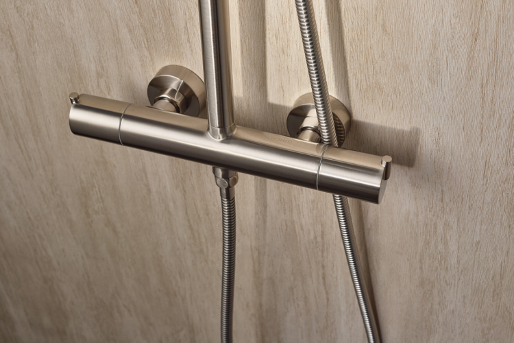 In this collection, you can always choose between a classic thermostatic model or a Dual Control shower column. All models feature an anti-limescale overhead shower and a single-function anti-limescale hand shower.