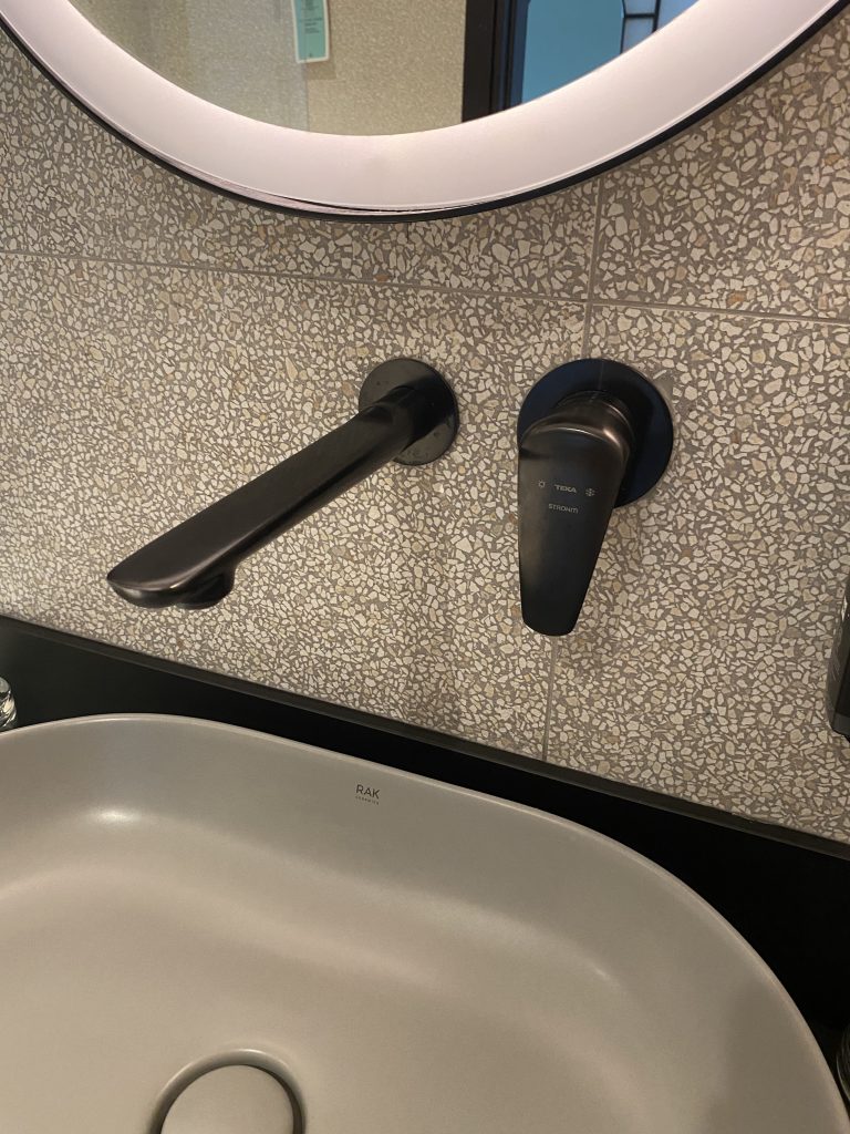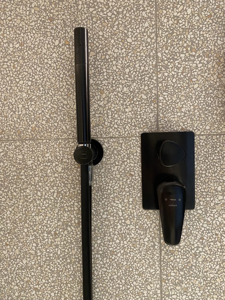 Bathrooms equipped with black taps from the Itaca series by Strohm Teka, a series that stands out for its high quality and design as well as for its metallic black colour, and shower area with Inca anti-slip tray.