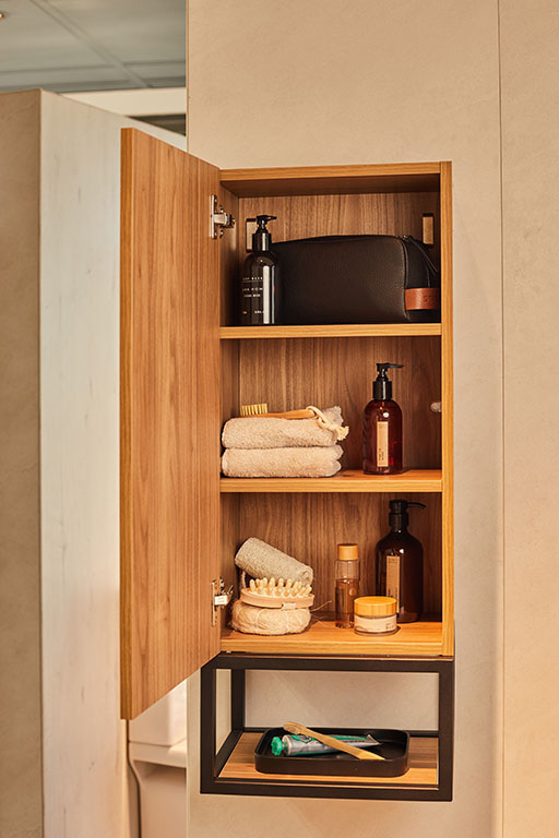 Cajas etiquetadas y colgadores ayudan a mantener todo a mano. Con los accesorios de baño STROHM TEKA en acabado PVD, puedes organizar sin renunciar al diseño aunque también puedes agregar una columna lateral y tener todo muy cerca pero sin ruido visual.